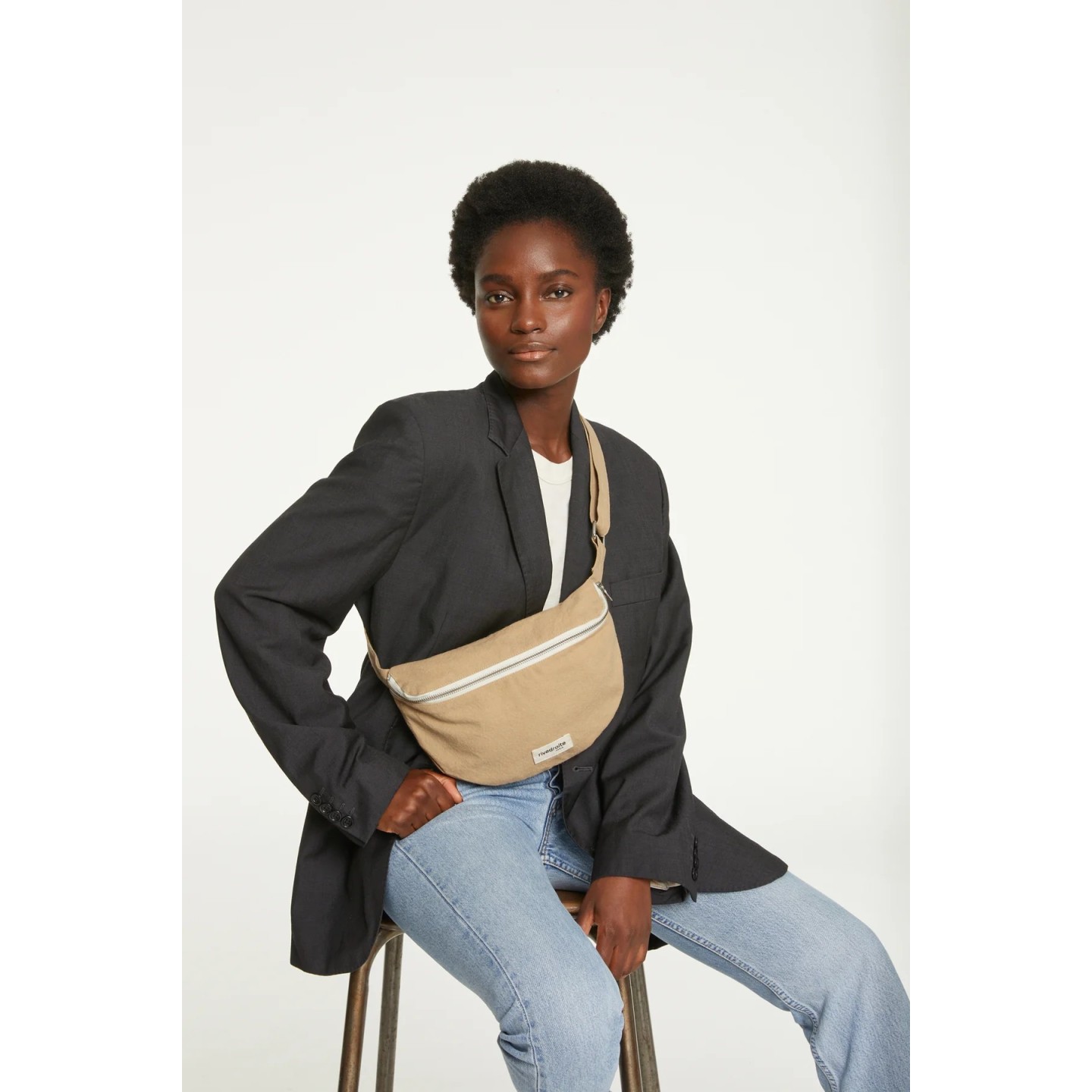 « Custine, le sac banane beige qui fait la diff : assez grand pour trimballer clés, téléphone, portefeuille et rouge à lèvres, tout en gardant les mains libres. Sa sangle réglable te laisse choisir : à la taille pour un look rétro ou en bandoulière pour filer l’air de rien. »