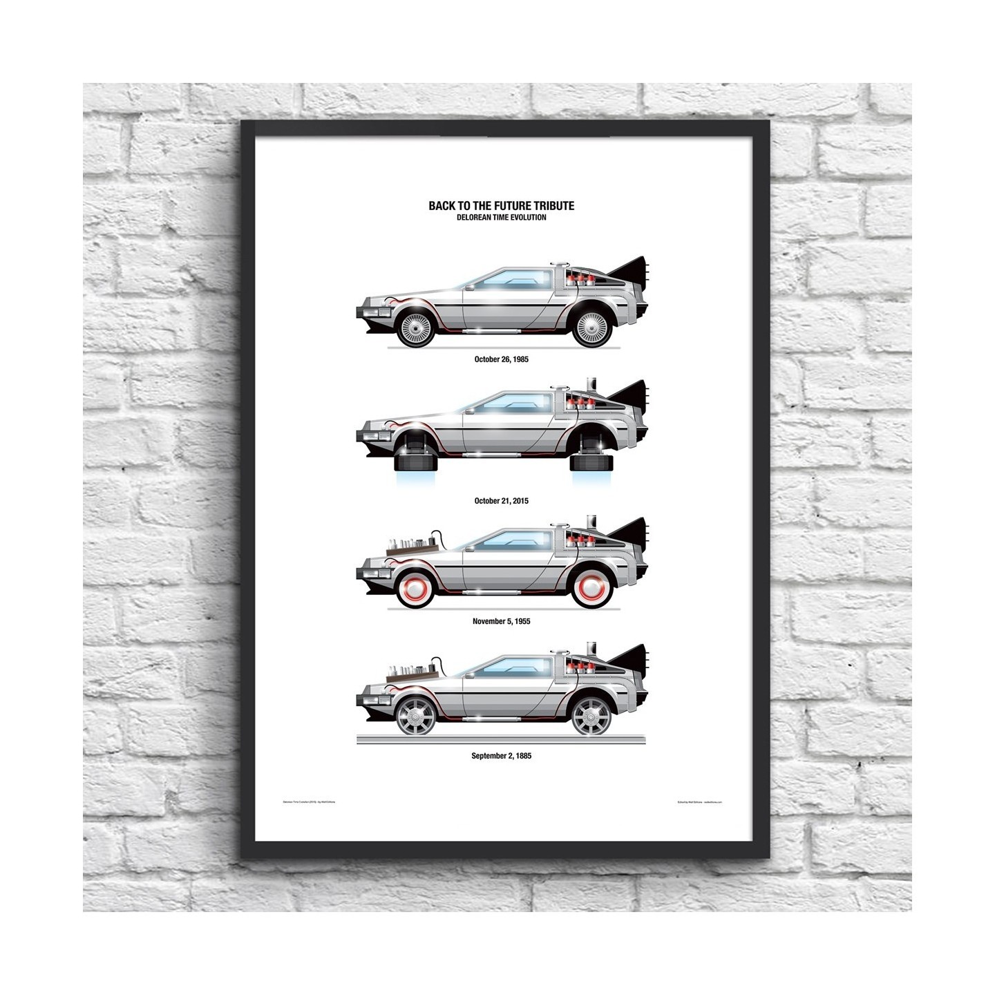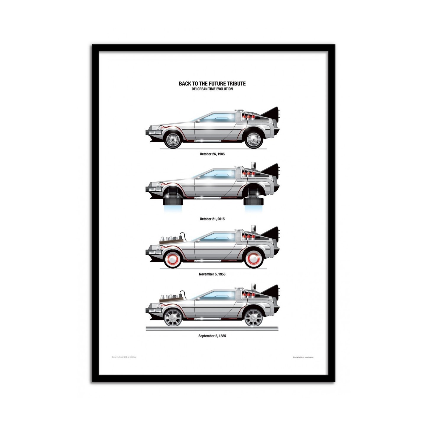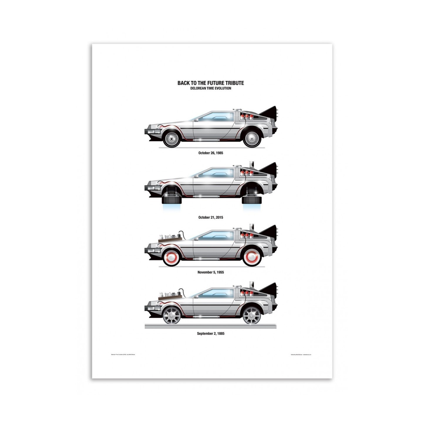 Chaque version de la voiture est représentée avec des détails distincts pour refléter les modifications subies au fil de ses aventures à travers le temps. Véritable hommage visuel au film culte de Robert Zemeckis, cette affiche séduira aussi bien les amateurs de cinéma que les passionnés de design rétro-futuriste.