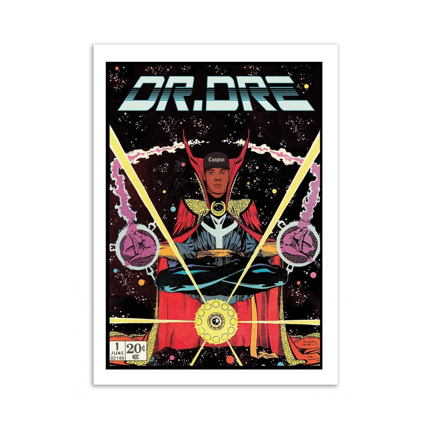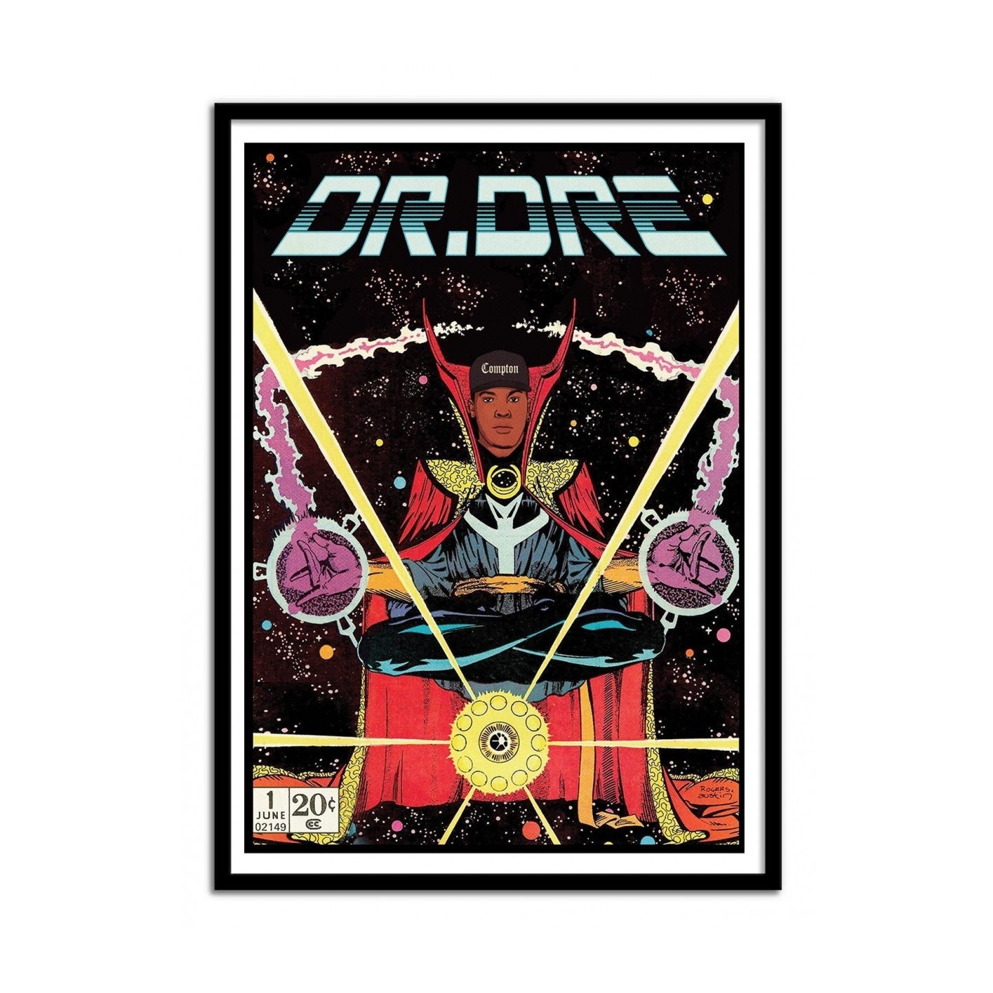 Cette affiche murale humoristique réinvente le légendaire Dr. Dre sous les traits du Dr Strange, le sorcier suprême de Marvel Comics.