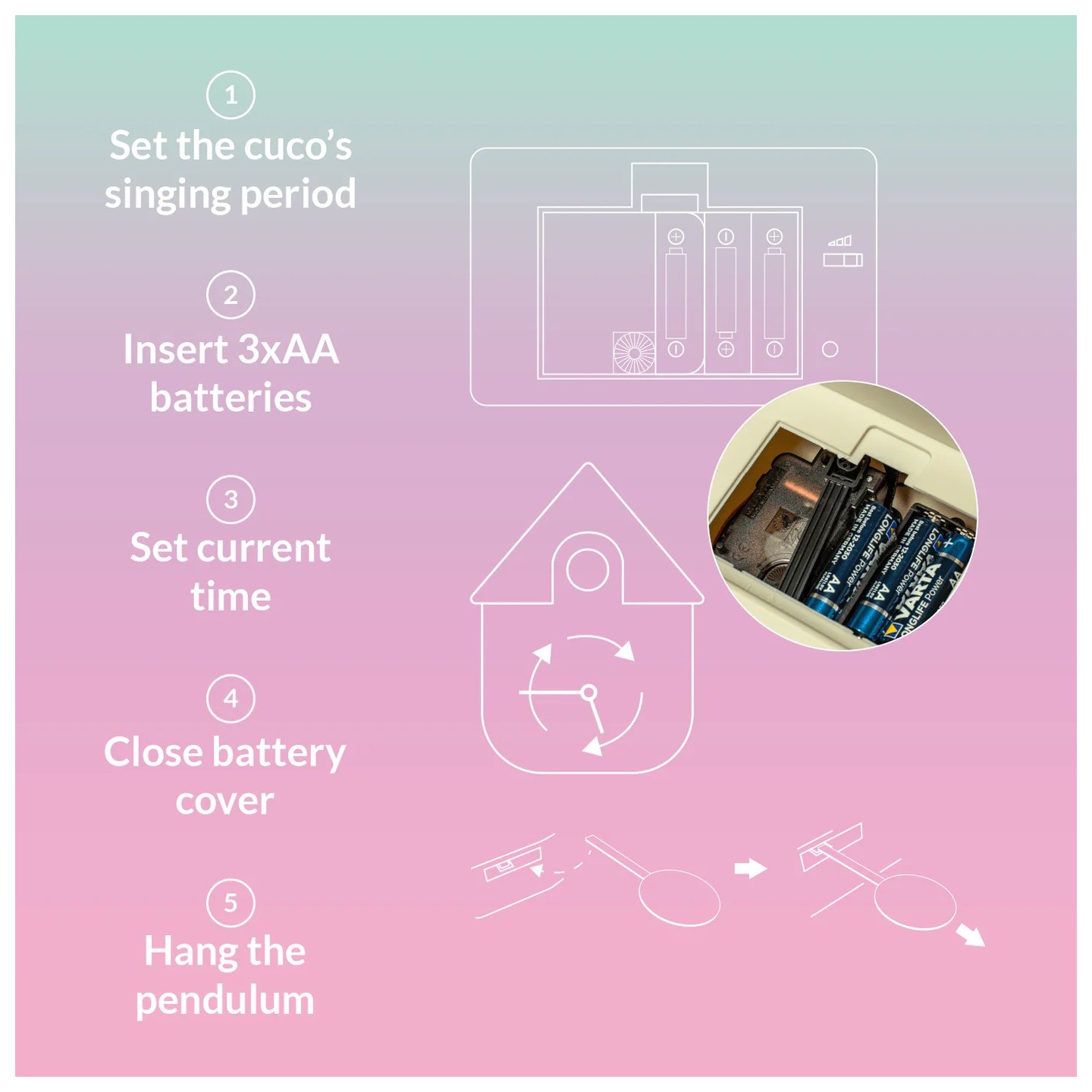 Il est important de noter que le coucou chante automatiquement pendant 16 heures et reste silencieux pendant 8 heures. Pour que votre horloge soit silencieuse la nuit, vous devez insérer les piles une première fois. Elle se taira à 16 h, puis chantera à nouveau 8 heures plus tard. Par exemple, si elle indique 7 h 45 lorsque vous insérez les piles, elle sonnera pendant les 16 heures suivantes : 8 h, 9 h, etc., sonnant une dernière fois à 23 h et restant silencieuse jusqu'à 8 h.